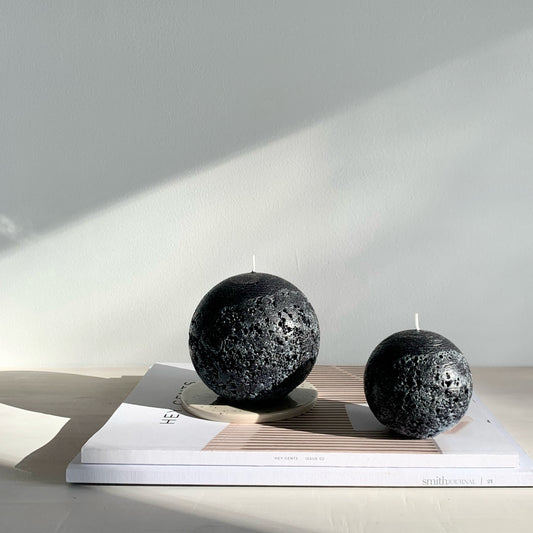 Reminiscent of the surface of the moon, each sphere candle is hand-poured at low temperature to create a striking textured finish. From full moon to total eclipse, our sphere candles go through all the lunar phases as they slowly burn up.