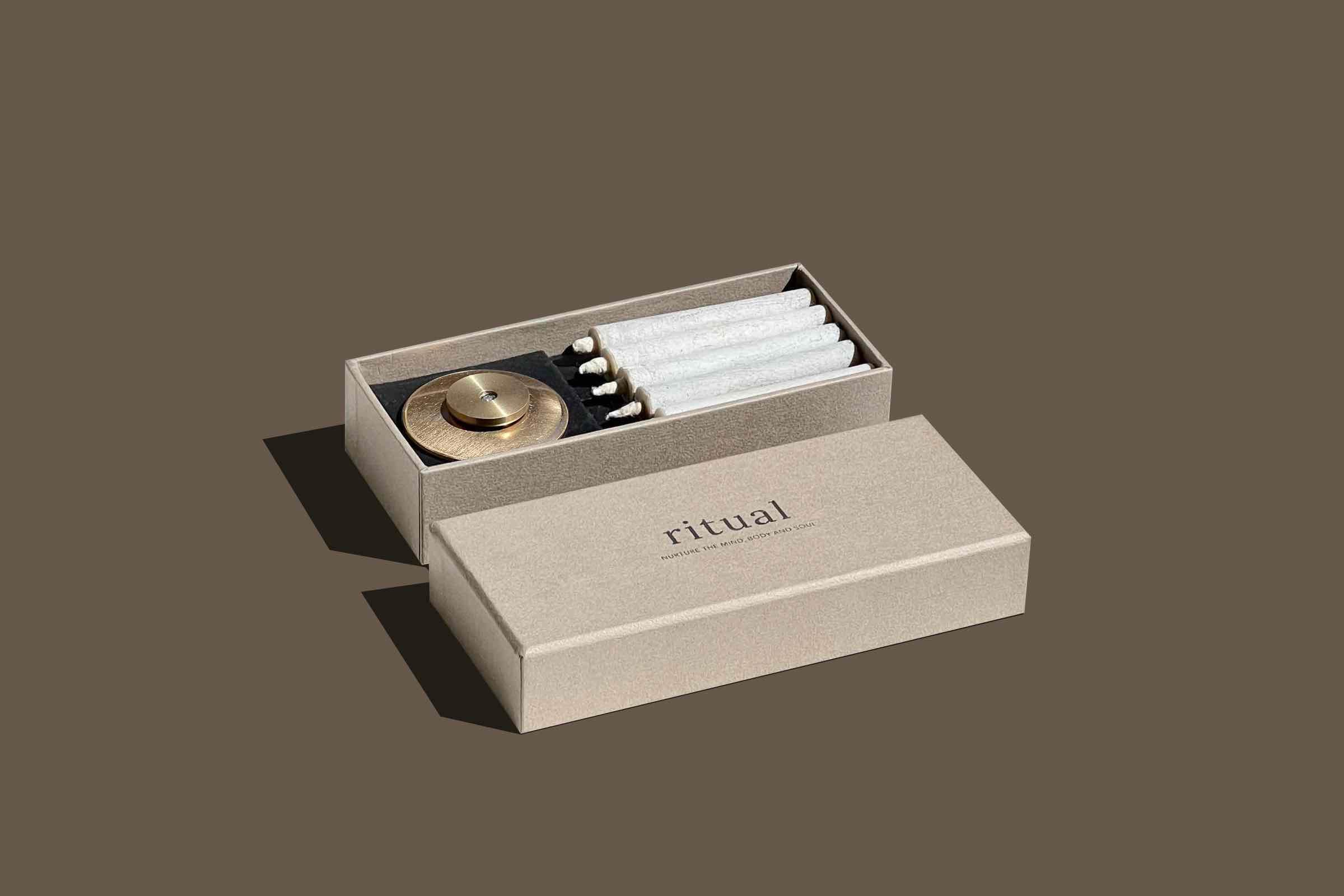 Our Ritual Sets come in a gift box which includes candles, a brass candle stand and a ritual introduction guide.